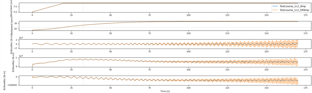 The simulations for the graphs above were performed using OpenFAST using the Beamdyn model for the blades. As is clearly visible, the reduction in the structural damping has resulted in an instability occurring, resulting in much higher loads, that may increase even further if the simulation would have run longer. This illustrates that the difference in damping cannot be covered by the usual safety factors used in load calculations.