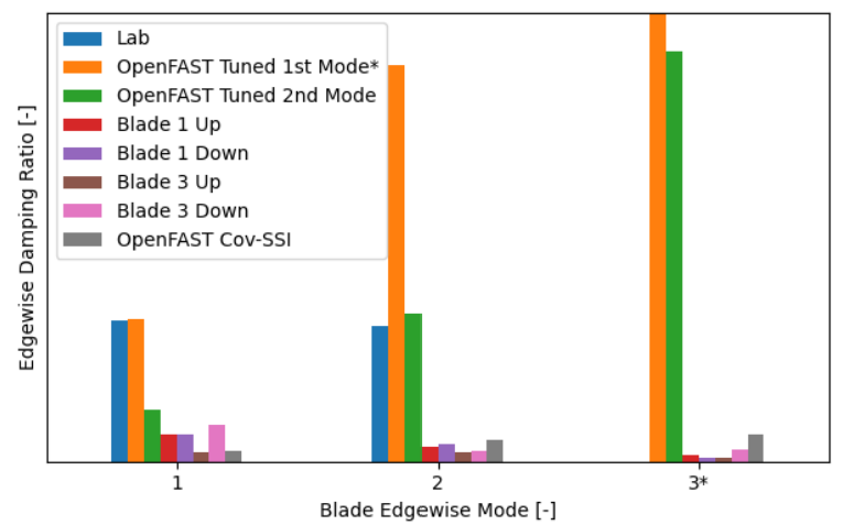 Now, a recent article actually shows that the assumption of higher damping for higher modes may be inaccurate: https://iopscience.iop.org/article/10.1088/1742-6596/2767/2/022069 Edgewise Structural Damping of a 2.8-MW Land-Based Wind Turbine Rotor Blade, from Mayank Chetan and Pietro Bortolotti, J. Phys.: Conf. Ser. 2767 022069. Tests on a full turbine were performed in an attempt to compare the structural damping of the first, second and third edgewise mode. Note that it is stated in the article that the approach used to get the damping, Cov-SSI often results in much lower values than expected, so comparing these new measurements to other results is not valid. The following figure is from that article: